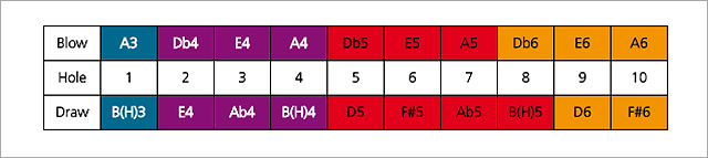 Таке розміщення нот, насамперед, обумовлено тим, що це гармошка у мажорній тональності, тому на ній леко грати мажорні мелодії. Також далекоглядний винахідник Ріхтер передбачив аби на ній було зручно грати акордами. Тому граючи будь-які 3 отвора на видих – ми отримуємо акорд A-major, а отвори з 1-го по 4-тий на вдих – дають акорд E-major.