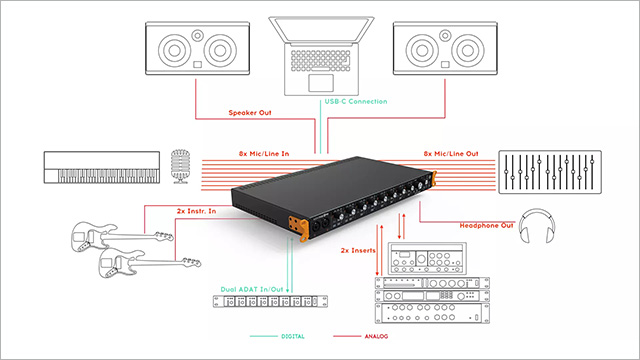 Кількість і якість інтерфейсів у AudioFuse Studio вражає! Комбіновані входи доступні в режимах Inst/Line/Mic, плюс доступні функції інвертування фази та подачі фантомного живлення. Крім того, AudioFuse Studio обладнаний 2 роз'ємами Phono/Line, 4 Insert-входами, L/R роз'ємами AUX OUT. Для виводу, посилу та обробки сигналу передбачені 4 виходи TRS, 8 цифрових ADAT входів/виходів, один S/PDIF вхід/вихід, MIDI IN/OUT та 3 USB-порти. AudioFuse Studio збирає все в одному місці завдяки вишуканому робочому простору, виконаному за принципом «одна кнопка — одна функція», так що Ви можете сконцентруватися на найголовнішому — Вашій музиці.