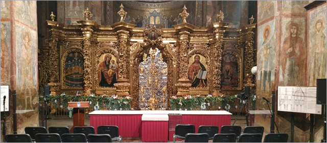 - Обмеження по місцю і розташуванню обладнання. Велика аудиторія (300 чол.) не залишала можливості вільної розстановки обладнання. До того ж, враховуючи історичну і культурну цінність архітектурних елементів (фрески XI ст. тощо) була очевидна неможливість розстановки обладнання близько до стін. Це майже виключило з використання системи на акустичних штативах і фермах.