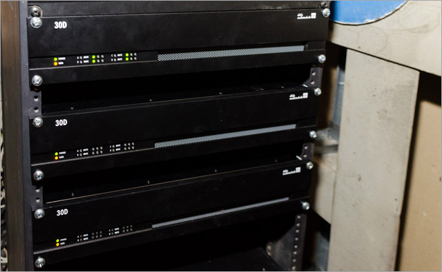 Особливо хочеться відзначити вершину інженерної думки, власну розробку d&b – інсталяційні підсилювачі 30D, що забезпечують кожний по 4 вихідних канали, сумарною потужністю 6400 Ватів. Таких підсилювачів в інсталяції використовується три. Оснащені просунутим DSP і власною ОС, підсилювачі управляються й контролюються віддалено за допомогою програми R1 або через web-інтерфейс.