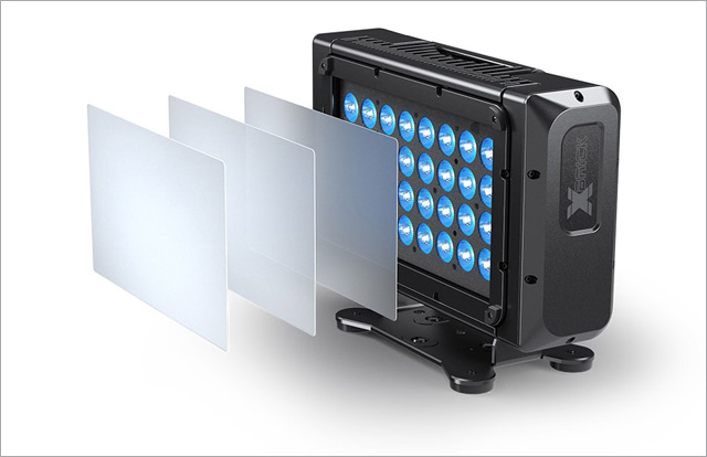 Х-BRICK підходить для рішення безлічі завдань з архітектурним і сценічним освітленням завдяки легкій і швидкій зміні голографічних фільтрів з різними кутами розкриття, без використання якого-небудь інструменту. Причому три фільтри: 20/40°° і 60°x10° входять у стандартну комплектацію.