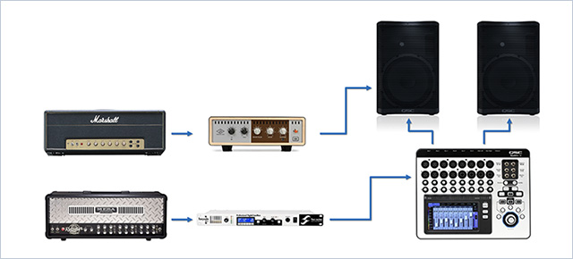 Ще одна популярна конфігурація гітарного сетапу – це підключення гітарного підсилювача «голови» до зовнішнього боксу навантаження, який має цифрову DSP емуляцію динаміка або перетворювача, що імітує відповідний імпеданс навантаження, а також електричні та акустичні характеристики справжнього динаміка, встановленого в кабінет. Вихід з боксу навантаження надсилається або безпосередньо до вашої системи серії СР, або ж на головну мікшерну консоль, а з неї – на системи CP, що використовуються у якості портальних.