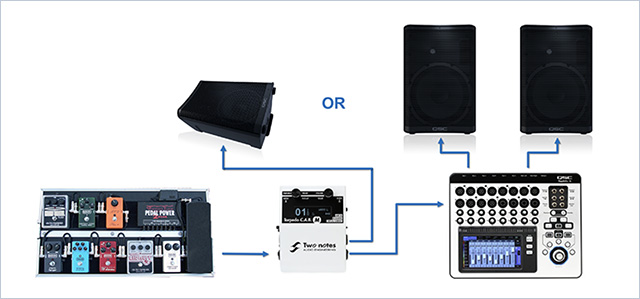 Наступний варіант – це використання педалей ефектів без гітарного підсилювача у поєднанні з емулятором кабінету (у форматі педалі або рекового пристрою), підключеним безпосередньо до систем серії CP, що використовуються у якості портальних, або ж у якості персональних моніторів.