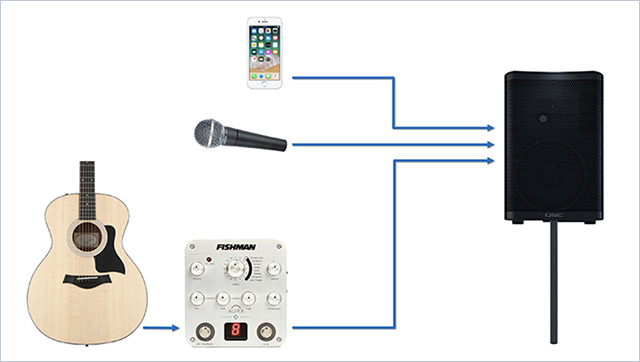 Для гітаристів, які використовують електроакустичні інструменти, рекомендується наступна конфігурація сетапу. Ви можете надіслати вихідний сигнал з акустичної гітари до передпідсилювач або директ-бокс, які потім безпосередньо під’єднуються до портальних або моніторних систем серії CP. Крім цього, маючи кілька входів, якими оснащені гучномовці серії CP, ви можете підключити мікрофон до комбінованого входу XLR/«джек», а також зовнішнє джерело звуку через окремий стереовхід з роз`ємом 3,5 мм.