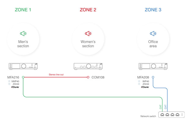 Функція лінійного виходу налаштовується користувачем, дозволяючи створити одну велику зону або справжню двозонну систему з індивідуальним регулюванням гучності для обох виходів (внутрішній підсилювач і лінійний стереовихід). Вони мають цифрове управління через передню панель, TCP/IP і AUDAC Touch™.