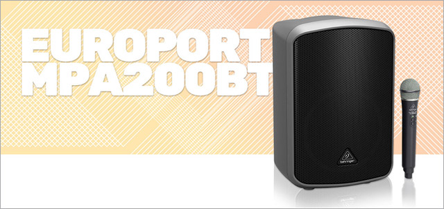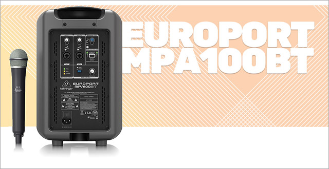 Behringer EUROPORT MPA100BT і EUROPORT MPA200BT представляє собою комплект, що складається з акустичної системи потужністю 100/200 Вт і безпровідного мікрофона Behringer Ultralink ULM300USB. Портативна акустична система EUROPORT MPA100BT/MPA200BT ідеально підходить для вечірок, шкіл, корпоративних і освітніх презентацій, семінарів, аеробіки, аукціоністів, діючих музикантів, гідів, весіль і т.д. Використовувати надзвичайно легку, але потужну систему EUROPORT MPA100BT/MPA200BT можна для прослуховування музичних записів з Bluetooth-сумісного пристрою iOS на пікніку, корпоративі або для передачі повідомлення на ігровому полі. Завдяки своєму 100/200-ватному підсилювачу і високоякісній двосмуговій акустичній системі, MPA100BT/MPA200BT забезпечить чудовий звук для 300/500 осіб. Робота від мережі живлення або автономної батареї до 20 годин безперервного використання.