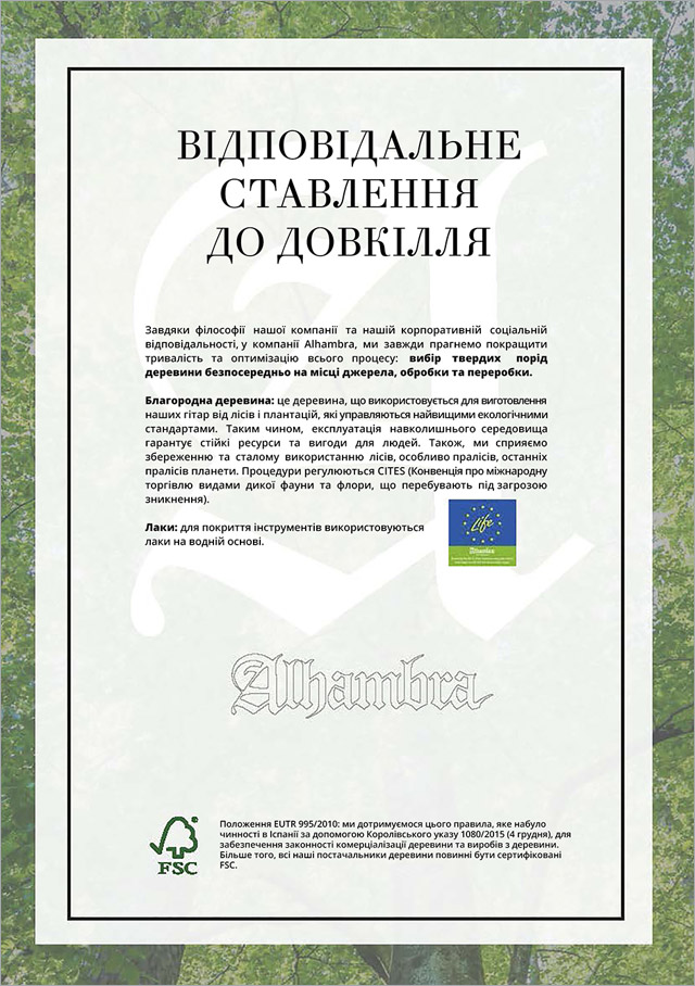 Благородна деревина: це деревина, що використовується для виготовлення наших гітар від лісів і плантацій, які управляються найвищими екологічними стандартами. Таким чином, експлуатація навколишнього середовища гарантує стійкі ресурси та вигоди для людей. Також, ми сприяємо збереженню та сталому використанню лісів, особливо пралісів, останніх пралісів планети. Процедури регулюються CITES (Конвенція про міжнародну торгівлю видами дикої фауни та флори, що перебувають під загрозою зникнення).