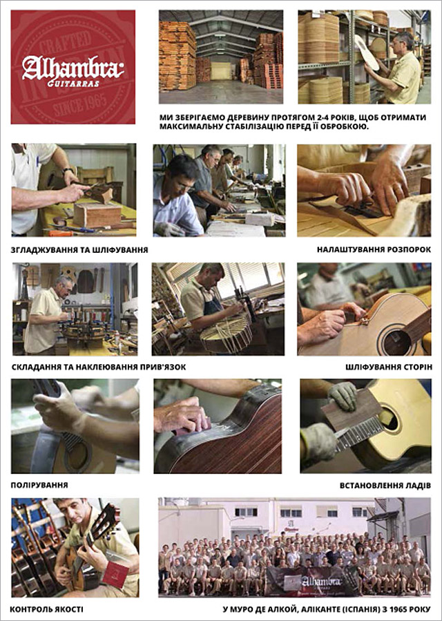 З першого моменту заснування бренду Alhambra, була закладена концепція поєднання високого рівня майстерності з новітніми технологіями для створення найкращих та найякісніших інструментів. Саме Alhambra володіє заслуженою репутацією у всьому світі як виробника неперевершеної продукції. Всі інструменти бренду Alhambra славиться своїми традиціями і широким спектром ручної роботи, на кожній стадії виробництва.
