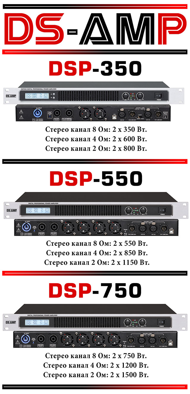 Компанія SOUNDLIGHT пропонує вашій увазі надійні цифрові підсилювачі класу D з DSP процесором від виробника DS-AMP, які широко використовуються як в інсталяціях так і в турових роботах! Модельний ряд DSP – 350/550/750 відрізняється своєю легкістю, потужною і чіткою роботою з навантаженням до 2 Ом. Підсилювачі спроектовані на основі сучасних імпульсних технологій та пропонують вам в компактному одноюнітовому корпусі вихідну потужність на 2 х 800 Вт.; 2 х 1150 Вт. та 2 х 1500 Вт. В підсилювачах встановлена новітня система охолодження, що забезпечує стабільну роботу підсилювача та контролює температурний режим кожного із каналів. Також передбачений стабілізатор вхідної напруги та захист від короткого замикання.