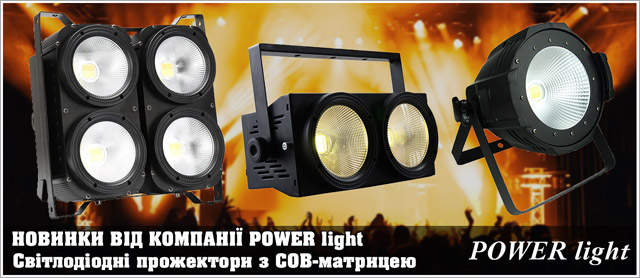 Компанія POWER light представляє світлодіодні бліндери з COB-матрицею (chip-on-board) теплого і холодного білого кольору світіння (мультічіп 2в1), потужністю 2х100W і 4х100W, а також COB PAR потужністю 1х100W.