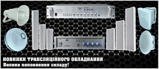 На склад компанії SOUNDLIGHT надійшло велике поповнення трансляційного обладнання! Тепер в асортименті є всі необхідні види обладнання для професійного фонового озвучування в торгових центрах, спортивних спорудах, пабах, ресторанах, храмах, офісних і складських приміщеннях: акустичні системи як для внутрішнього, так і для вуличного застосування, врізні стельові динаміки, трансляційні підсилювачі, рупорні акустичні системи, а також регулятори гучності.