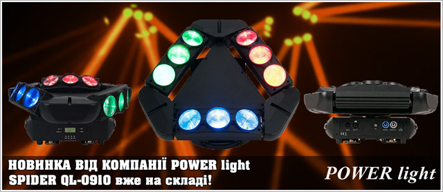 Багатопроменевий світлодіодний прилад POWERlight QL-0910 вміщує в себе три рухомих планки які створюють «Spider» ефект, 9 скляних лінз забезпечують заповнення приміщення ефектом бім променів. Джерелом світла в ньому виступають дев'ять RGBW світлодіодів потужністю по 10 ват кожен. QL-0910 ідеально підійде для використання в нічних клубах, барах, ресторанах, на танцювальних майданчиках та інших аналогічних закладах.