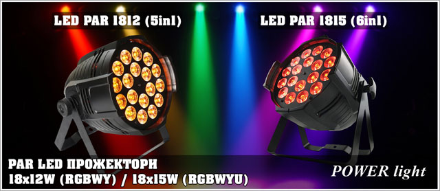 Потужні світлодіодні PAR прожектори 18х15 Вт, та 18х12 Вт. За допомогою RGBWY і RGBWYU мікшера, користувач може отримати будь-який колір або відтінок. Крім потужного світлового потоку, моделі відрізняються можливістю плавної зміни кольору і наявністю стробоскопічного ефекту зі змінною швидкістю. При 25 градусному розкритті, прожектори здатні ефективно освітлювати великі приміщення та сцени і будуть хорошим вибором для шоу, масових заходів або концертів.