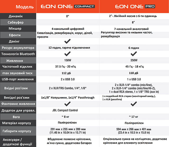 Якщо вам потрібен більш масштабний звук – його пропонує портативна система звукопідсилення JBL EON ONE PRO. Вона укомплектована повноцінним масивом з шести динаміків, сабвуфером, 7-канальним мікшером, підтримкою потокової передачі сигналу через Bluetooth та низкою вхідних/вихідних аудіороз`ємів, разом формуючи комплексну акустичну систему з акумуляторним живленням, що володіє шестигодинним ресурсом робочого часу – і все це в компактному корпусі вагою 17 кг.