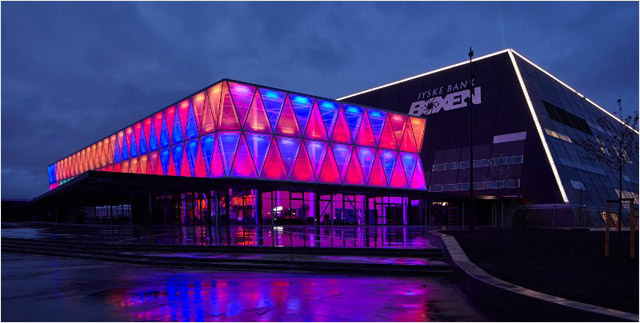 Конструктори мультифункціональної арени Jyske Bank Boxen, що у Гернінгу, Данія, прагнули оживити її ззовні і зсередини. Їм було необхідне рішення архітектурного світла, що поєднувало б високу продуктивність змішування кольорів та підтримку динамічного світлового дизайну.