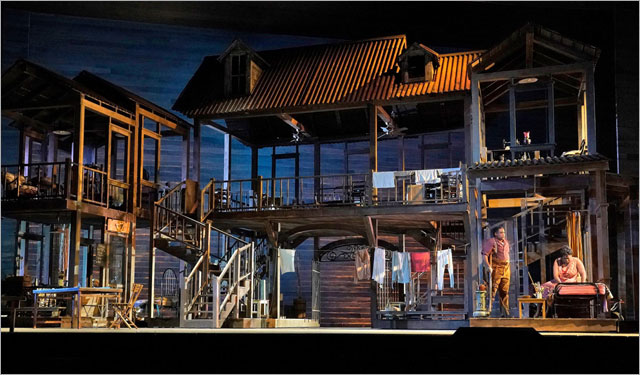 Сценічний дизайн опери Поргі та Бесс створив Майкл Єарган. Він представлений двоповерховим комплектом декорацій, що обертається у восьми різних позиціях протягом 16 сцен. Дональд Холдер зазначає: «Мені були потрібні багато світлових пристроїв, розташованих у численних позиціях, які могли б з точністю освітити певні частини декорацій у потрібній послідовності. Світлові прилади Artiste Monet виконали основну масу цієї роботи, і я дуже задоволений їхньою якістю та надійністю».