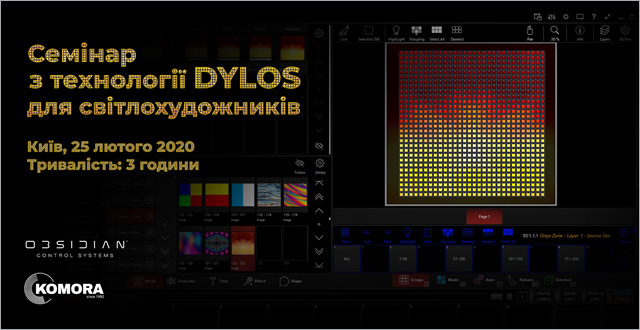 25 лютого запрошуємо вас на семінар з технології DYLOS від Obsidian Onyx. Організатор – «Комора», ексклюзивний дистрибютор компанії Obsidian Control Systems в Україні. Ведучий – Сергій Шевчук, спеціаліст професійного світлового обладнання «Комори».