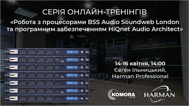 14-16 квітня «Комора» спільно з Harman Professional провела серію онлайн-тренінгів на тему «Робота з процесорами BSS Audio Soundweb London та програмним забезпеченням HiQnet Audio Architect».