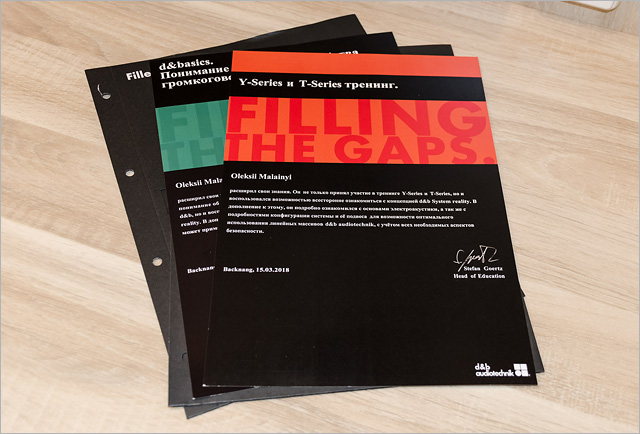 Усі учні пройшли фінальний тест з вивчених матеріалів і одержали сертифікати, які підтверджують кваліфікацію у опанованих областях, а також знання продукції d&b і вміння професійно з нею працювати. Побажаємо їм удачі, тепер у їхніх руках техніка d&b audiotechnik повинна працювати з максимальною віддачею!