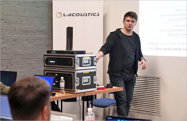 Представник компанії L-Acoustics, інженер підтримки турового напрямку Сєргєй Беккер був присутній на остаточній верифікації Павла Мінєєва під час весняної сесії тренінгів L-Acoustics в Києві.