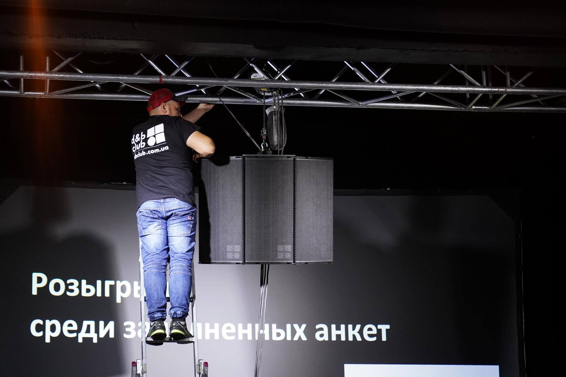 Безумовно, для професіоналів найбажанішою частиною виявилося прослуховування і тут вони отримали можливість розгулятися на повну. Масив демонструвався в вертикальному варіанті, перемонтовувався у всіх на очах в горизонтальний, був випробуваний навіть граундстек з різними кутами. Враження найпозитивніші: для таких компактних розмірів відмінне покриття і хороший звуковий тиск, з впізнаваним фірмовим саундом d&b.