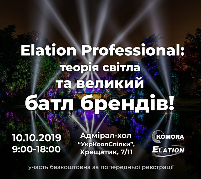10 жовтня компанія «Комора» - офіційний та ексклюзивний представник Elation Professional в Україні – проводить презентацію світлового обладнання за участі представника компанії в рамках сертифікованої програми Elation Professional.