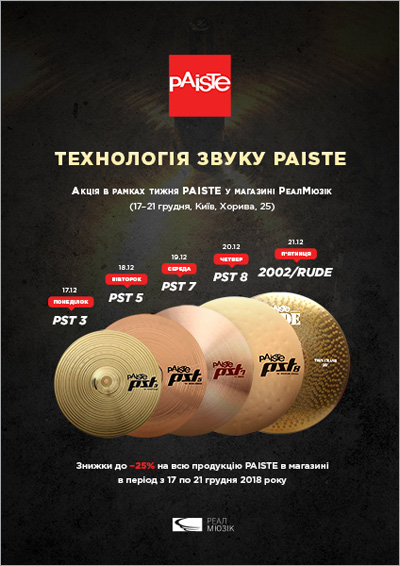 Друзі, ми раді повідомити вам, що з 17 до 21 грудня 2018 року ми проводитимемо «Тиждень бренда PAISTE». Протягом цього періоду в нашому магазині діятимуть знижки до -25%, і кожен день тижня буде присвячено окремій серії PAISTE: