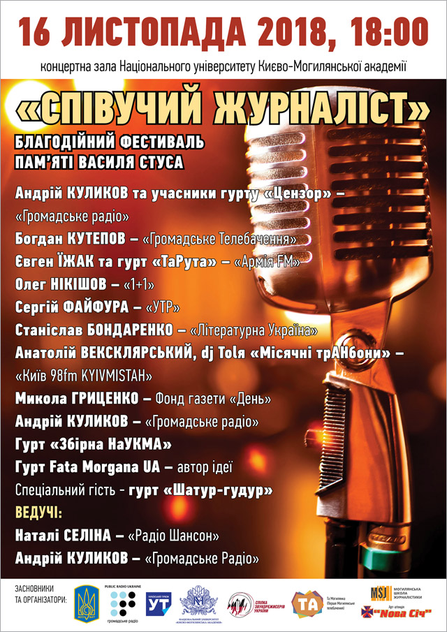У День робітника радіо, телебачення та зв`язку – 16 листопада о 18.00 у концертній залі Національного університету «Києво-Могилянська академія» відбудеться благодійний фестиваль пам`яті Василя Стуса «Співучий журналіст».